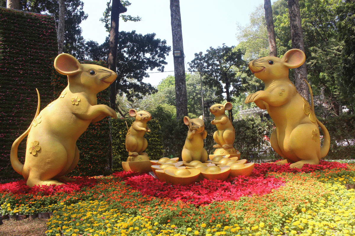 Hình ảnh "cô dâu chú rể" chuột được thể hiện tại Hội hoa xuân Tao Đàn.