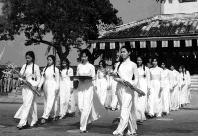 Những nữ sinh thập niên 1970 xinh xắn, hồn nhiên trong đồng phục áo dài trắng.