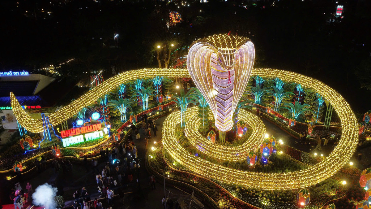 Đường hoa Xuân Ất Tỵ 2025 tại TP Tuy Hòa (Phú Yên) vừa được khai mạc vào tối 19/1 với linh vật tết mang tên Kim Tỵ Phú Quý - Hổ mang chúa khiến người dân và cộng đồng mạng khen ngợi.