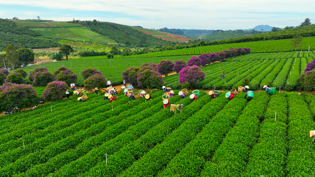 Sắc tím hoa mua, màu xanh đồi chè và sắc màu từ những giỏ đựng chè của công nhân nông trường đã biến nơi đây thanh một bức tranh đẹp mắt.