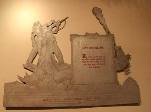 | Tấm phù điêu Bảng vàng ghi công được làm bằng mảnh xác máy bay AD-6, Trung đội Dân quân gái xã Hoàng Trường và Hoàng Hải, tỉnh Thanh Hoá bắn rơi ngày 16/11/1967. |