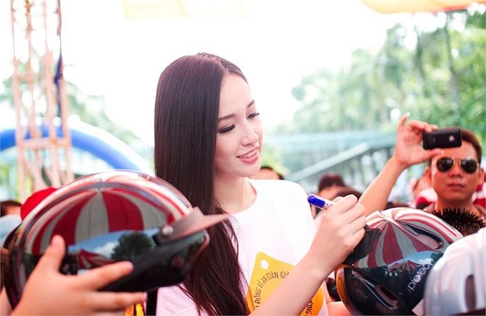 Hoa hậu ký tặng các em nhỏ trên mũ.