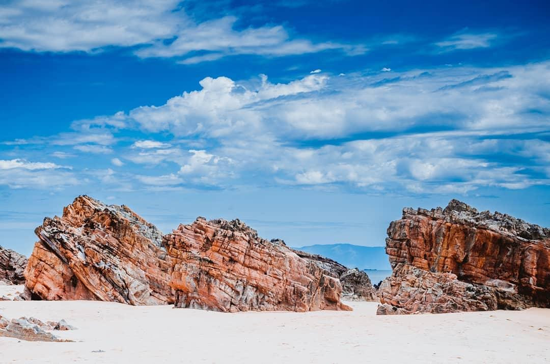 Không chỉ rải rác trên bờ, hoặc chụm thành những khối đá nhỏ như những bãi biển khác, nơi đây còn có những khối đá lớn mang hình hài những ngọn núi cao hàng chục mét.