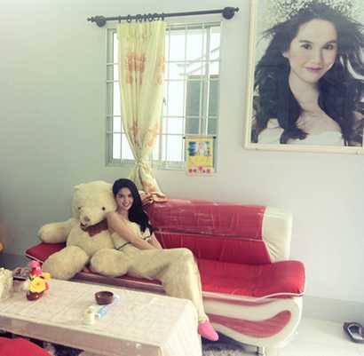 | Bộ ghế sofa có vẻ hợp với phong cách của Ngọc Trinh nhưng lại không hòa hợp lắm với tổng thể của không gian phòng khách. Sẽ ổn hơn nếu căn phòng này sơn màu trắng hoặc màu trắng kem. |