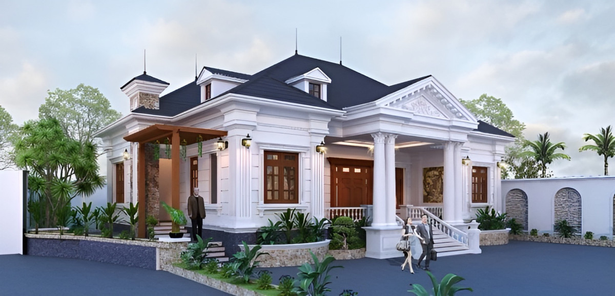 Biệt thự 1 tầng mang phong cách tân cổ điển vừa có chút hoài cổ vừa mang dáng dấp hiện đại. Được thiết kế với khoảng sân vườn trước cửa chính với nhiều cây xanh tỏa bóng mát mang đến không gian trong lành, mát mẻ. Ngoài ra, ngôi nhà còn được thiết kế với ba phòng ngủ, một phòng bếp và một nhà vệ sinh chung.