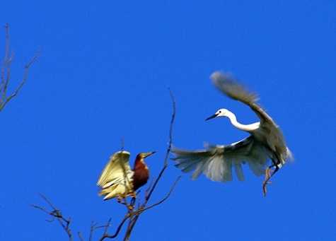 Nói là vườn cò nhà ông Đặng Đình Quyển là bởi người dân ở đây vốn đã quen gọi như thế, chứ thực ra vườn cò đã chuyển về tay chủ khác. Ông Quyển giờ chỉ còn là “người cũ”, chủ yếu làm công việc trông vườn. Chủ mới là một người khá trẻ, vì yêu mến cò, muốn giữ lại một vườn cò tránh khỏi dã tâm ăn thịt của dân nhậu nên mua lại. Ông chủ mới của vườn cò nổi tiếng này gần như giấu mặt. Và ông cũng hạn chế luôn số lượng người vào vườn để tránh những nguy cơ có thể xảy ra với loài chim vốn gắn liền với đồng ruộng Việt Nam. Có thể nhiều người biết chuyện ông mua lại vườn cò nhưng chắc chắn, chẳng có mấy người biết mặt vị chủ vườn trẻ tuổi này. “Cái cách quan tâm, đầu tư cho vườn của vị chủ mới chu đáo lắm, chẳng giống nhiều người trước đó, đến chỉ nhăm nhăm mua cò làm thịt”, ông Quyển nói. Ngoài ra, ông chủ giấu mặt này cũng rất hạn chế cho người vào thăm vườn dù đã có nhiều lời đề nghị mở tour du lịch đến đây. Thường thì những vị khách được đến đây chỉ có các nhà khoa học nghiên cứu về chim và giới báo chí. Nhưng thời gian họ được phép ở lại “làm phiền” đàn chim cũng không nhiều. Ai muốn nghiên cứu lâu thì phải đảm bảo không quấy nhiễu khiến chim sợ mà bỏ đi mất. Cái lạ ở chỗ, cả một vùng đồi núi rộng lớn thế này nhưng chẳng hiểu sao đám cò chỉ chọn vườn nhà ông Quyển. Chúng đậu kín các ngọn cây, chành chọe, chí chóe nhau đến váng đầu. Chim cò nhiều tới mức, dân chụp ảnh vào đây không cẩn thận là cò ị cho ướt người, hỏng máy. Một điểm thú vị nữa, đó là chỉ cần bước chân qua bờ rào, sang vườn nhà bên cạnh là lập tức không thấy có thêm bất cứ con chim nào. Chúng chấp nhận chật hẹp, chia nhau khoảng sống rộng hơn 3 hecta này. Thực ra cũng có lần chúng bỏ đi, tản mát khắp nơi. Lý do có thể bởi khi đó vườn còn chưa được quây hàng rào, biệt lập với xung quanh nên trộm vào bắt cò nhiều. Lúc đó, hai vợ chồng nhà ông Quyển lại phải cất công đi quanh xóm làng “mời” chúng về. “Nhưng giờ thì chúng nhất quyết ở đây rồi”, ông Quyển chia sẻ rồi bảo chúng tôi tìm góc đẹp sẵn sàng cho những bức ảnh cuối cùng của vườn cò. Nói rồi ông đi thẳng lên đỉnh đồi. Sau 2 tiếng vỗ tay, đàn chim chợt xáo động vỗ cánh bay rợp trời.