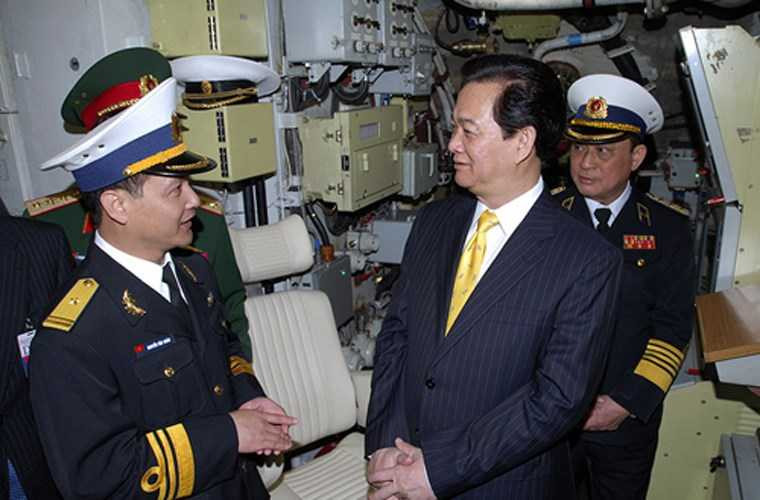 Thủ tướng Nguyễn Tấn Dũng thăm khoang vũ khí trên tàu ngầm HQ-182 Hà Nội. Tàu ngầm Project 636 trang bị 6 ống phóng ngư lôi cỡ 533mm có thể phóng nhiều loại ngư lôi chống tàu ngầm/tàu nổi và đặc biệt là tên lửa hành trình siêu thanh Klub-S (tối đa 4