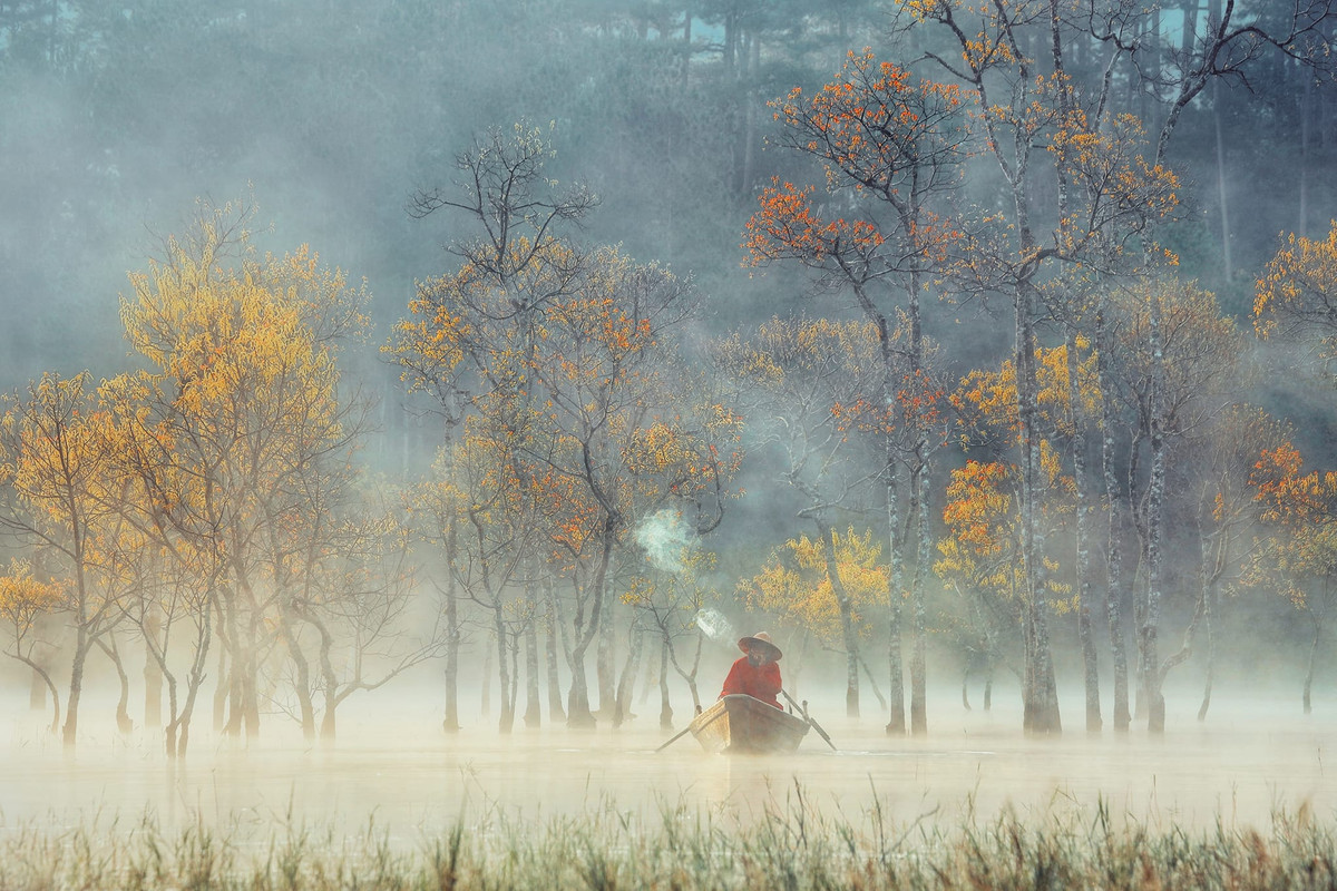 Sáng sớm, mặt nước phủ một làn sương mỏng đặc trưng của mùa xuân. Đến buổi trưa, nắng vàng rực bao trùm lấy không gian, khiến mọi thứ bừng sáng. Chiều, cảnh sắc trở nên tĩnh lặng như bước vào thu. Tới buổi tối, mùa đông như bao trùm với không khí se lạnh.