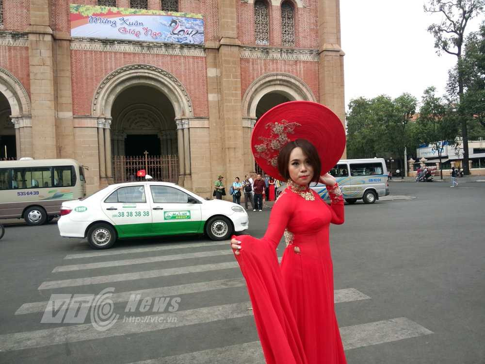 Người mẫu chụp hình trước nhà thờ Đức Bà