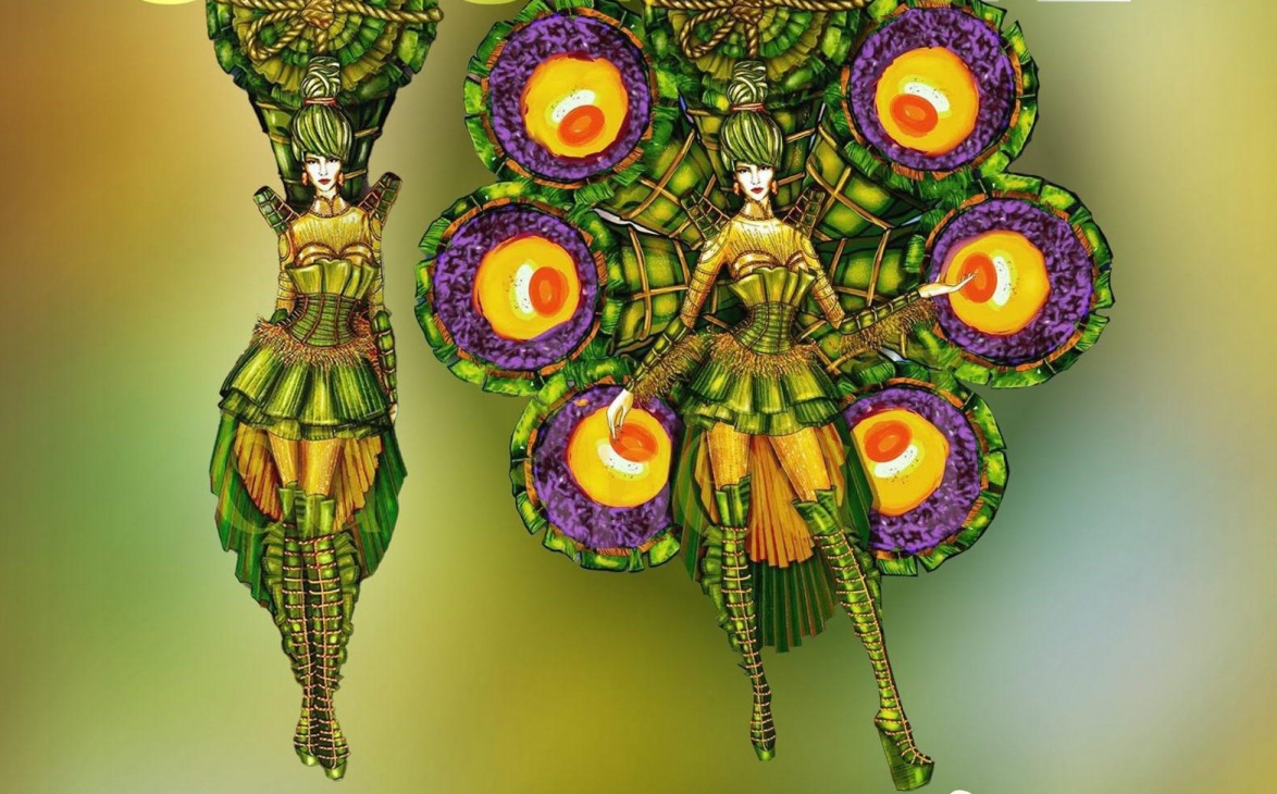 Thiết kế “Ai tét hông" của Khoa Lỗ, lấy cảm hứng từ món ăn không thể thiếu trong ngày Tết cổ truyền của người dân miền Nam được lựa chọn để Á hậu Kim Duyên giới thiệu đến bạn bè quốc tế qua cuộc thi Miss Universe 2021.