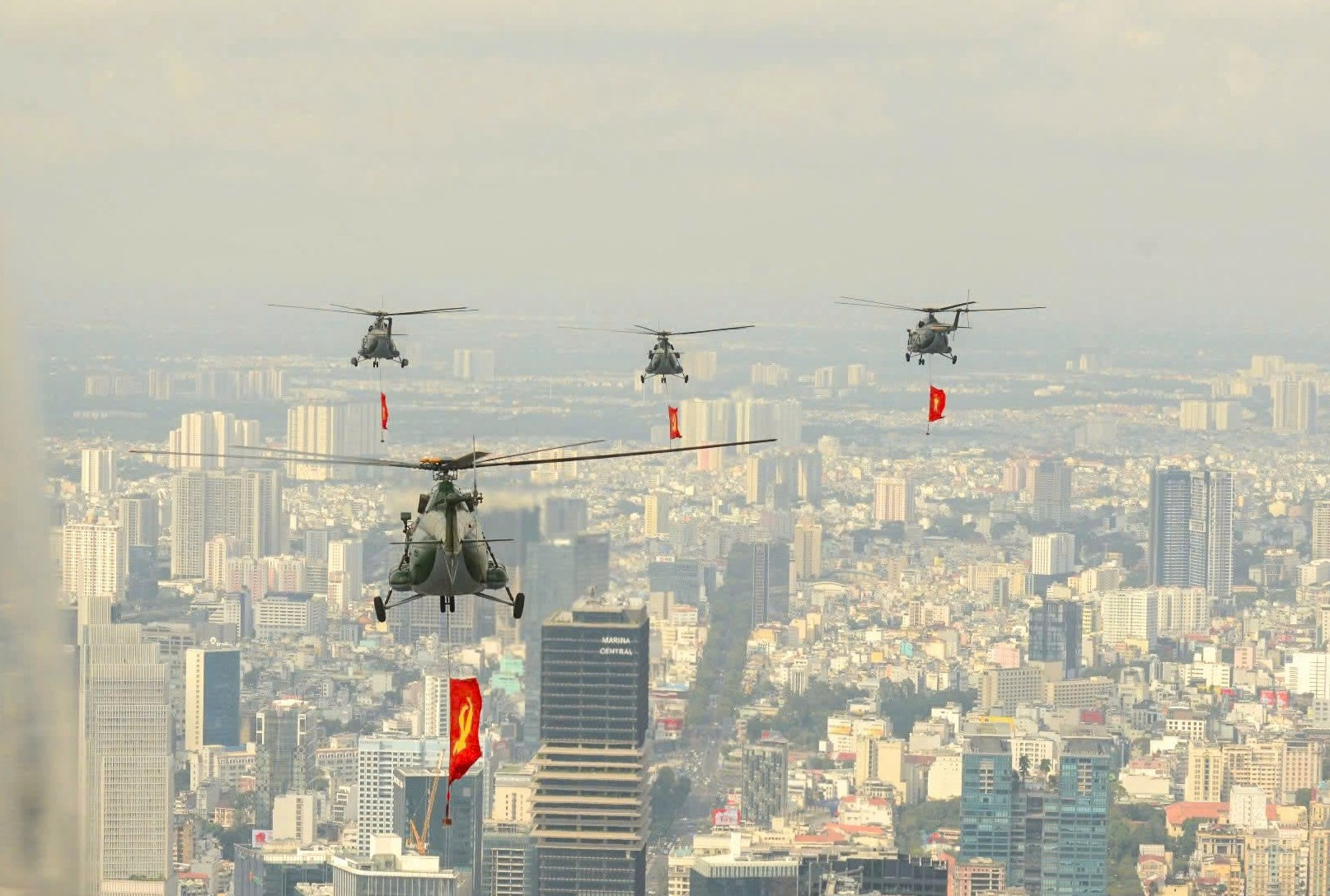 Trực thăng kéo cờ, tiêm kích nhào lộn trên bầu trời trung tâm TP.HCM sáng 22/4.