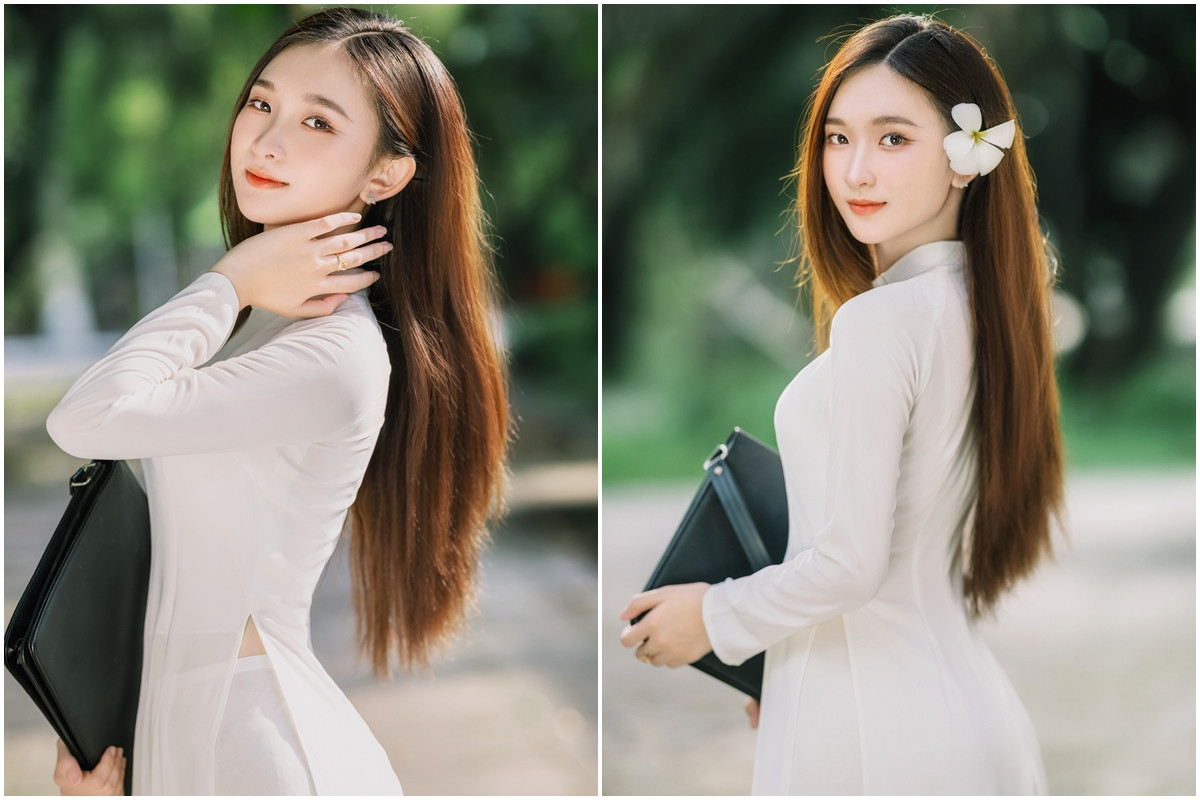 Mới đây, Trang nhận được "cơn mưa lời khen" trong những khoảnh khắc đẹp tinh khôi, cuốn hút. Nữ sinh rất thích ghi lại nét đẹp thanh xuân với trang phục áo dài, vừa kín đáo, thanh lịch, lại không kém phần ấn tượng. (Ảnh: Minh Kha)