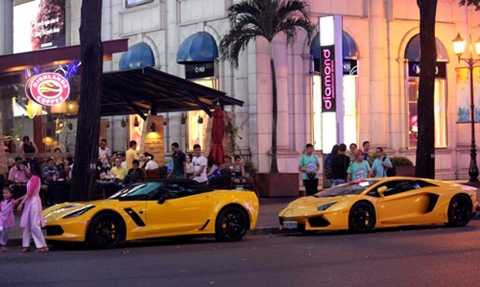| Bộ đôi Chevrolet Corvette (trước) và Lamborghini Aventador đồng màu tại Sài Gòn ngày 29 Tết. |