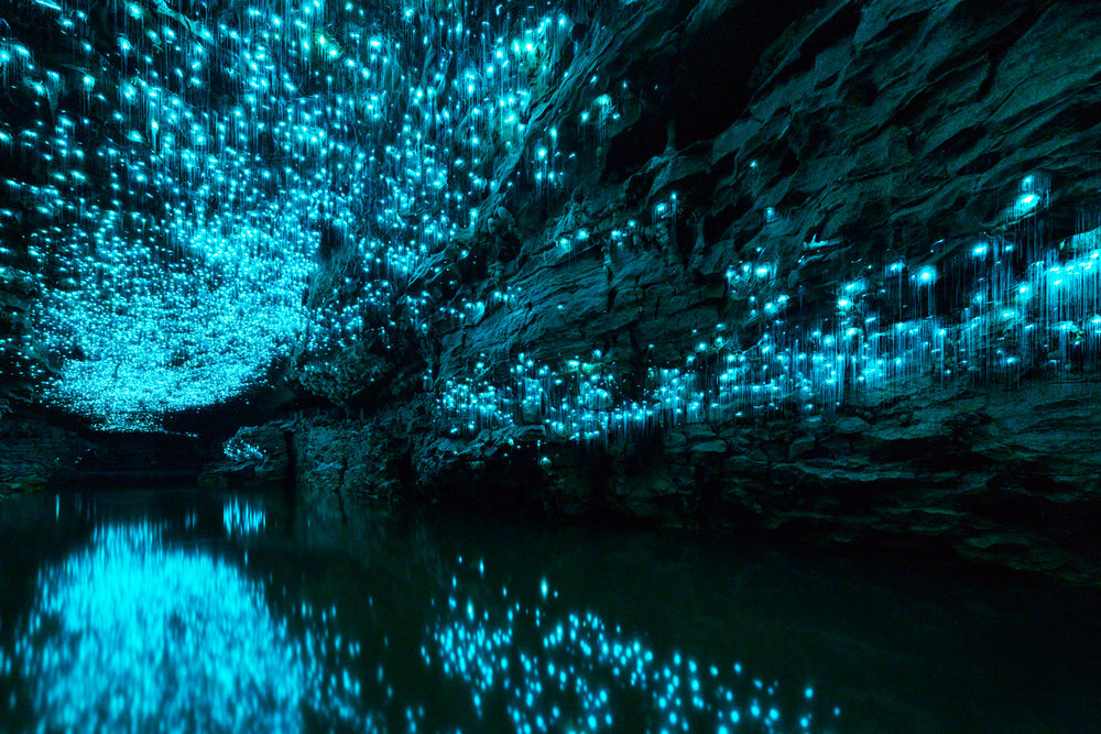 Waitomo Glowworm nằm sâu hơn 45m trong lòng đất, với cấu trúc hang động và hình dáng độc đáo do sự tác động của thiên nhiên theo thời gian. Hang động là nơi cư ngụ của hàng trăm loài đom đóm có tên khoa học là Arachnocampa Luminosa, chúng phát ra nguồn ánh sáng có màu xanh da trời pha với một chút màu xanh lá cây. Màu sắc này được phát ra nhờ vào hóa chất ở đuôi của chúng phản ứng với oxy để tạo thành.