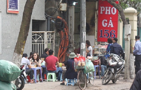 Sáng sớm là lúc mọi người đổ xô ra đường đi làm và đưa con em đến trường, vào thời điểm này mật độ giao thông rất đông. Tại địa điểm 156 đường Quán Thánh, một quán phở ngang nhiên kê những bộ bàn ghế tràn ra vỉa hè để đón những “thượng đế” đến dùng bữa sáng.