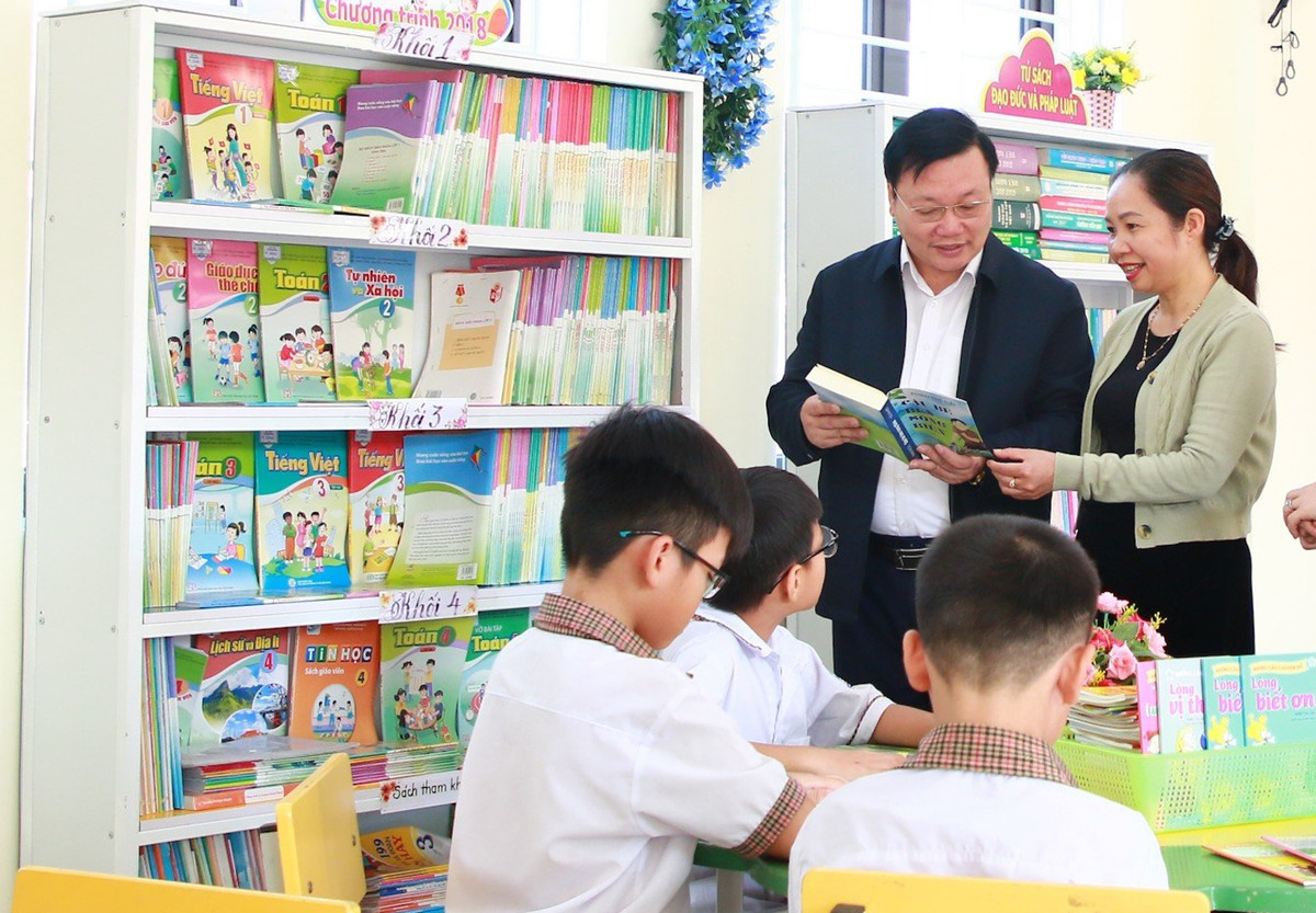 Lãnh đạo BHXH Hà Tĩnh thăm thư viện sách tại trường Tiểu học Thạch Hạ (TP Hà Tĩnh). (Ảnh: Nam Quốc)