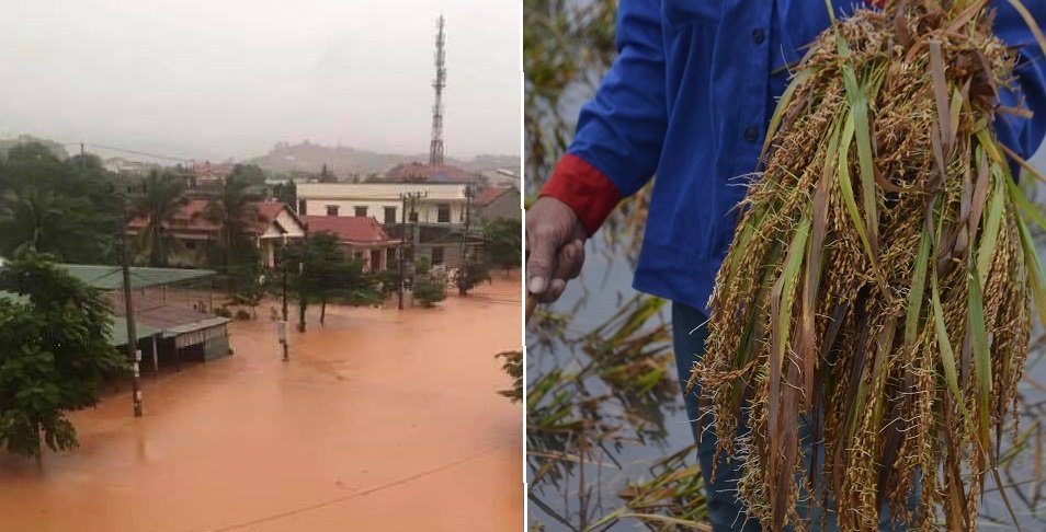 Lúa bị ngập sâu khiến việc thu hoạch của người dân thêm khó khăn, vất vả.