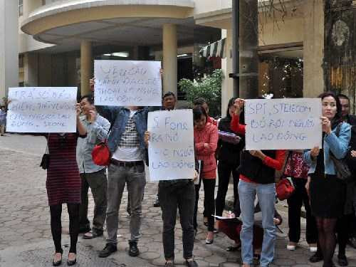 | Nhân viên S-Fone tụ tập yêu cầu lãnh đạo nhà mạng S-Fone trả tiền nợ lương. Ảnh: Người lao động. |