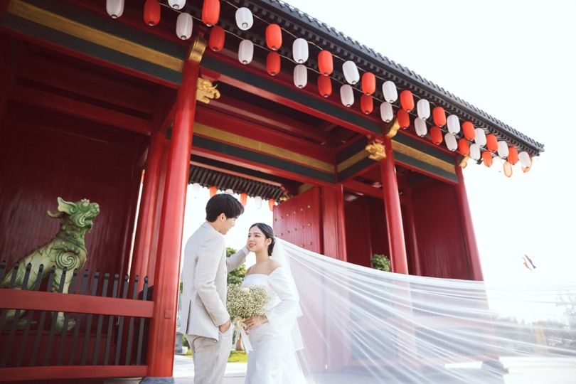 Cặp đôi này quyết định chọn vườn Nhật Vinhomes Smart City để lưu lại những khoảnh khắc hạnh phúc. Bối cảnh đầu tiên được chọn là cổng chào gỗ lớn với gam màu đỏ tượng trưng cho sự tương phùng trong văn hoá Á Đông. Cổng gỗ cũng chính là điểm nhấn ấn tượng của vườn Nhật Bản tại Vinhomes Smart City với ý nghĩa may mắn, thành công.