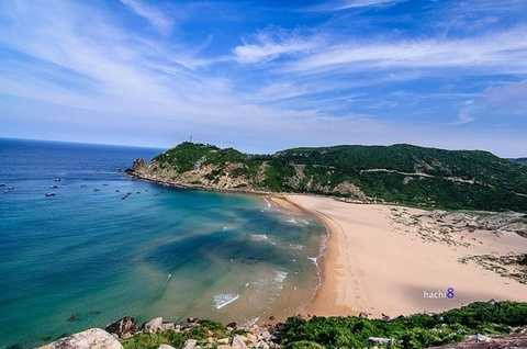 Đây còn là bãi biển đón bình minh sớm nhất ở Việt Nam. Phía trên cao bên phải là hải đăng Đại Lãnh với những vách núi cao tuyệt đẹp.