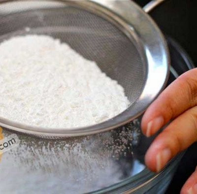 - Để bánh làm ra mịn và đẹp hơn, bạn cho bột bánh và bột bắp vào rây và rây qua
