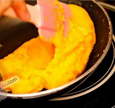 - Cho bơ vào phần hỗn hợp vừa rây xong, bắc lên bếp đun ở lửa nhỏ. Dùng thìa trộn đều đến khi hỗn hợp này đặc quánh và có màu vàng đẹp mắt thì tắt bếp để nguội. Bạn nên chia phần nhân này thành những viên nhỏ đều nhau cho tiện.