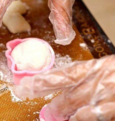 - Cho bột vào khuôn hình Kitty ép chặt. Trước khi cho vào khuôn, bạn nên lăn qua một lớp bột khô để bánh không bị dính vào khuôn.