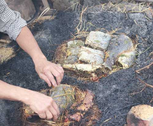 | Cá được xếp lên rơm nếp trước khi đốt |
