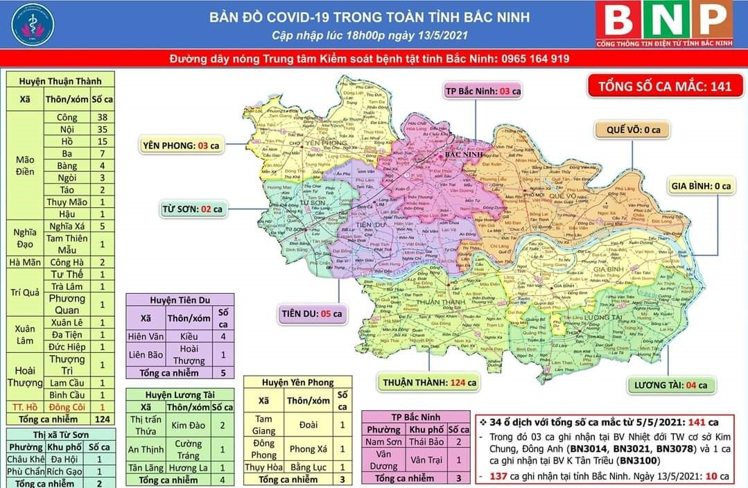 Đến 18h ngày 13/5, Bắc Ninh ghi nhận tổng cộng 141 ca dương tính SARS-CoV-2, trong đó có thêm 10 ca mắc mới trong ngày ở huyện Thuận Thành. Toàn tỉnh có 34 ổ dịch tại 6/8 huyện, thị xã, thành phố, huyện Gia Bình, Quế Võ chưa có ca nhiễm. Huyện Thuận Thành vẫn là ổ dịch lớn nhất tỉnh với 124 ca nhiễm.