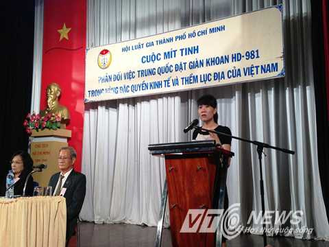 Tại cuộc mít tinh chiều 10/5, đông đảo hội viên Hội Luật gia cùng hàng trăm sinh viên trường Đại học Luật TP.HCM cực lực phản đối hành động Trung Quốc cố ý xâm phạm chủ quyền lãnh thổ Việt Nam, khiêu khích áp đặt theo kiểu bá quyền nước lớn, gây sự bất ổn định nghiêm trọng, đe dọa hòa bình, an ninh khu vực.