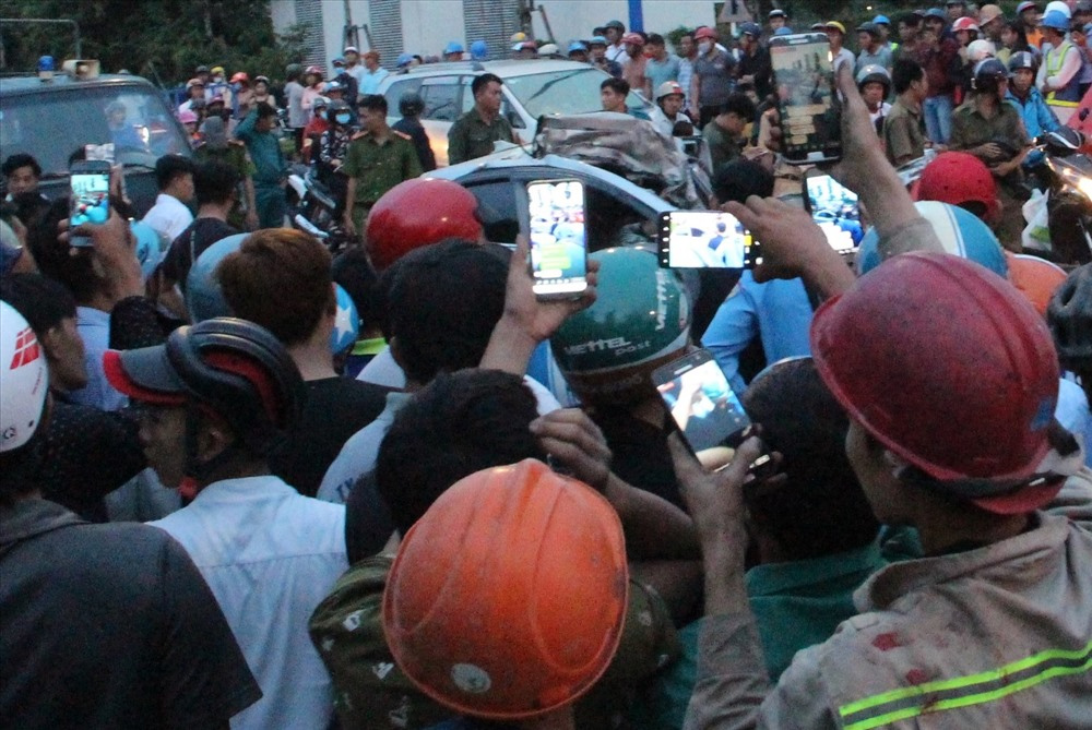 Người đi đường chen nhau chụp ảnh, livestream vụ tai nạn thương tâm ở Bình Dương ngày 19/7/2019. (Ảnh: Lao Động)