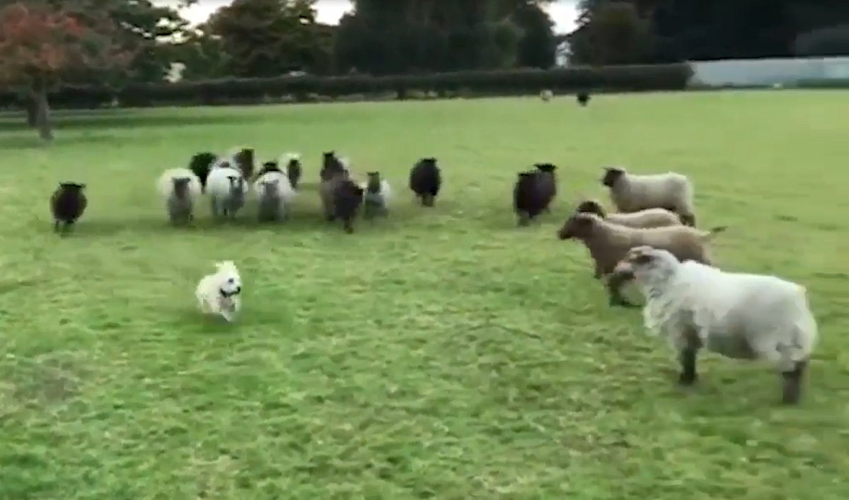 Ngày đầu đến nhận việc, chú chó chăn cừu nhỏ con bị đàn cừu doạ cho một vố hết hồn.