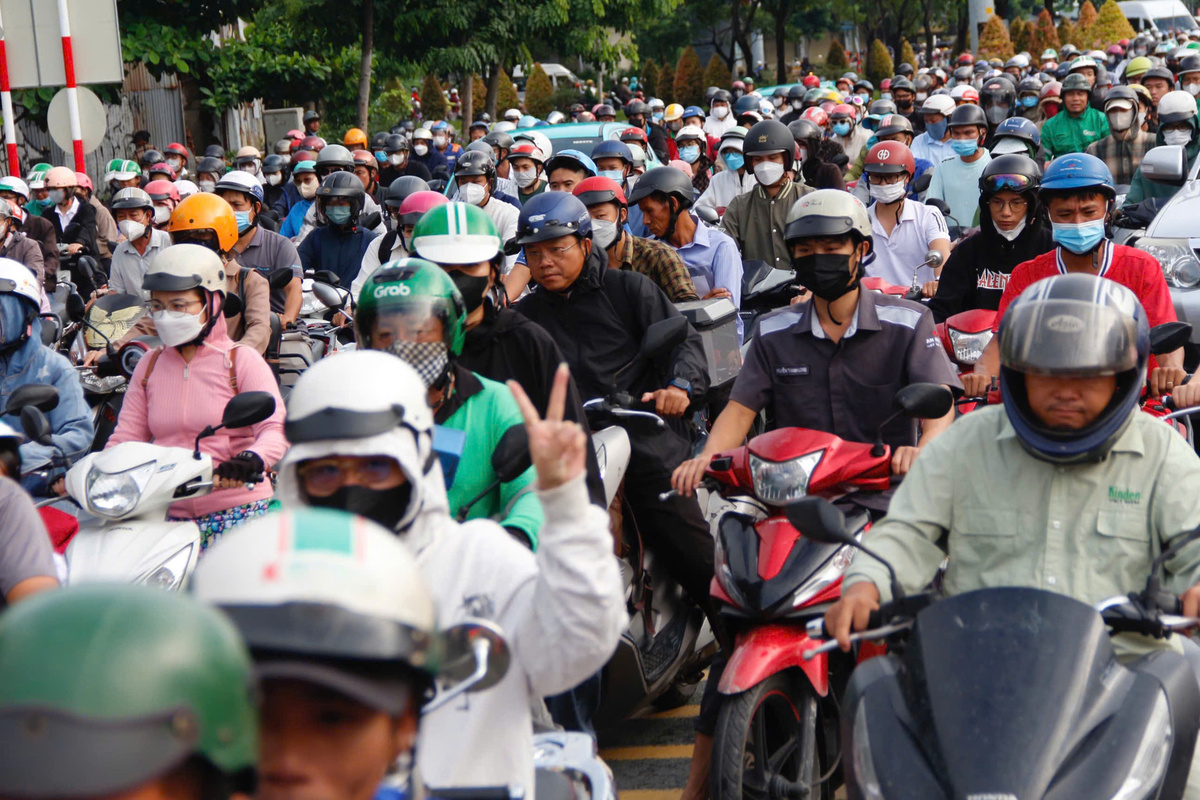 Người dân chen chúc di chuyển chậm tại hướng lên cầu Bình Triệu 2.