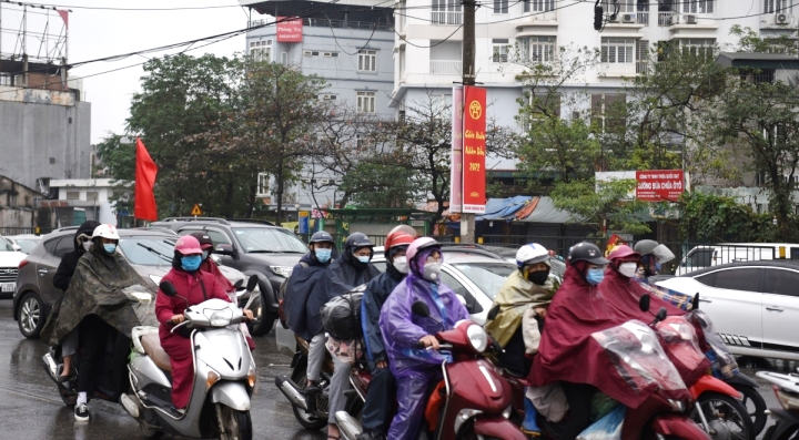 Do ảnh hưởng của gió mùa Đông Bắc, sáng nay (29/1) thời tiết Hà Nội có mưa, trời rét, nhiệt độ ngoài trời dưới 17 độ C. Hôm nay cũng là ngày nghỉ Tết âm lịch đầu tiên mặc dù thời tiết mưa, rét nhưng không cản được dòng người hối hả về quê ăn Tết.