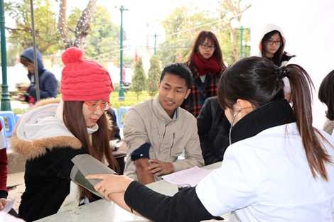 Không ngần ngại tiết trời giá buốt trong đợt rét kỉ lục ở miền bắc, hàng trăm bạn trẻ vẫn dang cánh tay hiến những giọt máu đào ấm nóng.Dưới tiết trời giá buốt của đợt rét lạnh nhất miền Bắc với nhiệt độ ngoài trời khoảng 10 độ, hàng trăm bạn trẻ đã không ngần ngại bỏ chiếc áo khoác ấm áp trên mình để dang cánh tay hiến những giọt máu đào ấm nóng. Mong muốn người bệnh được đón tết ấm áp, đoàn viên bên gia đình chính là tâm nguyện và động lực thôi thúc họ thực hiện nghĩa cử cao đẹp đó – hiến máu cứu người.Nằm trong chuỗi hoạt động của chùm sự kiện Tết hồng, thiết thực kỷ niệm 22 năm ngày thành lập Hội thanh niên vận động hiến máu Hà Nội, ngày 23/01/2016, Viện Huyết học – Truyền máu Trung ương phối hợp với Chi hội thanh niên vận động hiến máu 7/4 tổ chức ngày hội hiến máu "Tết đoàn viên” với thông điệp Cùng nhau đón tết – gắn kết yêu thương.8h00: Bất chấp thời tiết lạnh giá, nhiều người đến từ rất sớm để được hiến máu