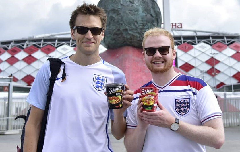 Cổ động viên người Anh thích thú với mì gói 3 Miền “đậm đà hương vị Việt” được người hâm mộ Việt Nam tặng để “bổ sung năng lượng” trước trận đấu (Ảnh: Minh Nam)
