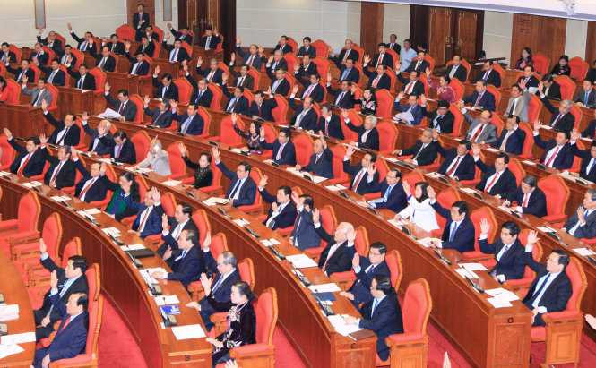 | Các đại biểu biểu quyết thông qua chương trình kỳ họp tại Hội nghị lần thứ 14 Ban Chấp hành Trung ương Đảng Cộng sản Việt Nam khóa XI - Ảnh: TTXVN |