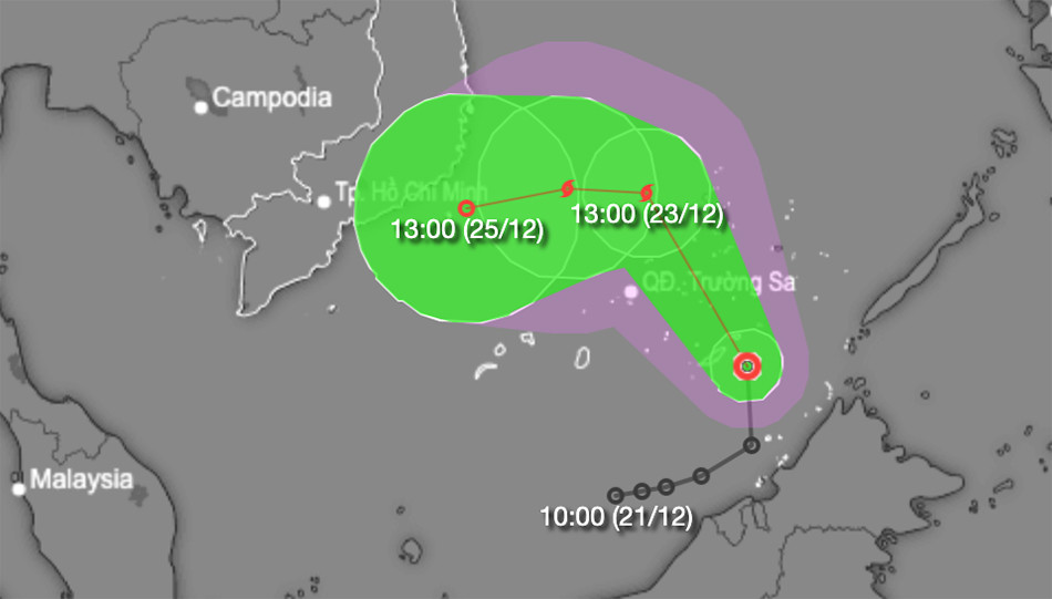 Theo Trung tâm Dự báo khí tượng thuỷ văn quốc gia, lúc 13h ngày 22/12, áp thấp nhiệt đới trên khu vực Nam Biển Đông, cách quần đảo Trường Sa khoảng 350km về phía Đông Đông Nam. Sức gió mạnh nhất vùng gần tâm áp thấp nhiệt đới mạnh cấp 7 (50-61km/h), giật cấp 9. Áp thấp di chuyển theo hướng Bắc, tốc độ khoảng 20-25km/h.