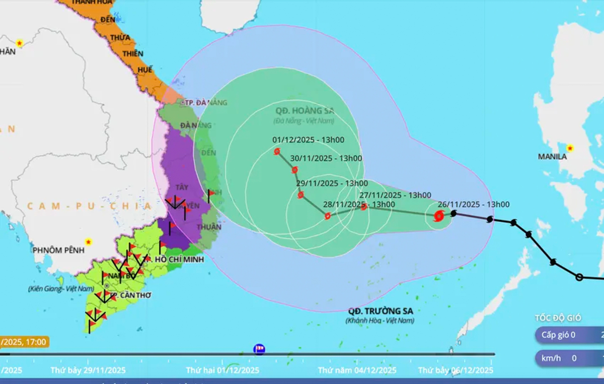 Về diễn biến bão số 15, đến 16h ngày 26/11, tâm bão đang ở cách đảo Song Tử Tây (thuộc quần đảo Trường Sa) khoảng 230 km về phía Đông Bắc, với sức gió gần tâm bão mạnh cấp 10 (89-102 km/h), giật cấp 13.