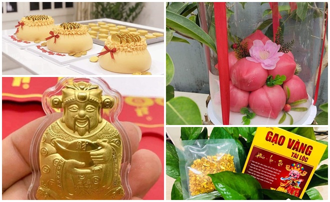 Bên cạnh các đơn vị cung cấp vàng bạc lớn, thị trường ngày vía Thần Tài năm nay còn nhộn nhịp với các sản phẩm mạ vàng, bao lì xì Thần Tài, bánh bao đào tiên, bánh kem Thần tài, bánh dừa hũ vàng...
