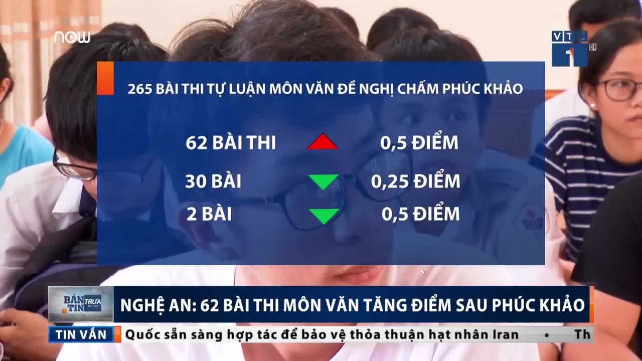 04/08/2018 15:51:00 +07:00Sở GD-ĐT Nghệ An cho biết đã có kết quả 265 bài thi tự luận môn Văn đề nghị chấm phúc khảo, trong đó 62 bài thi tăng 0,5 điểm, 30 bài giảm 0,25 điểm, 2 bài giảm 0,5 điểm nên phải đối chất.