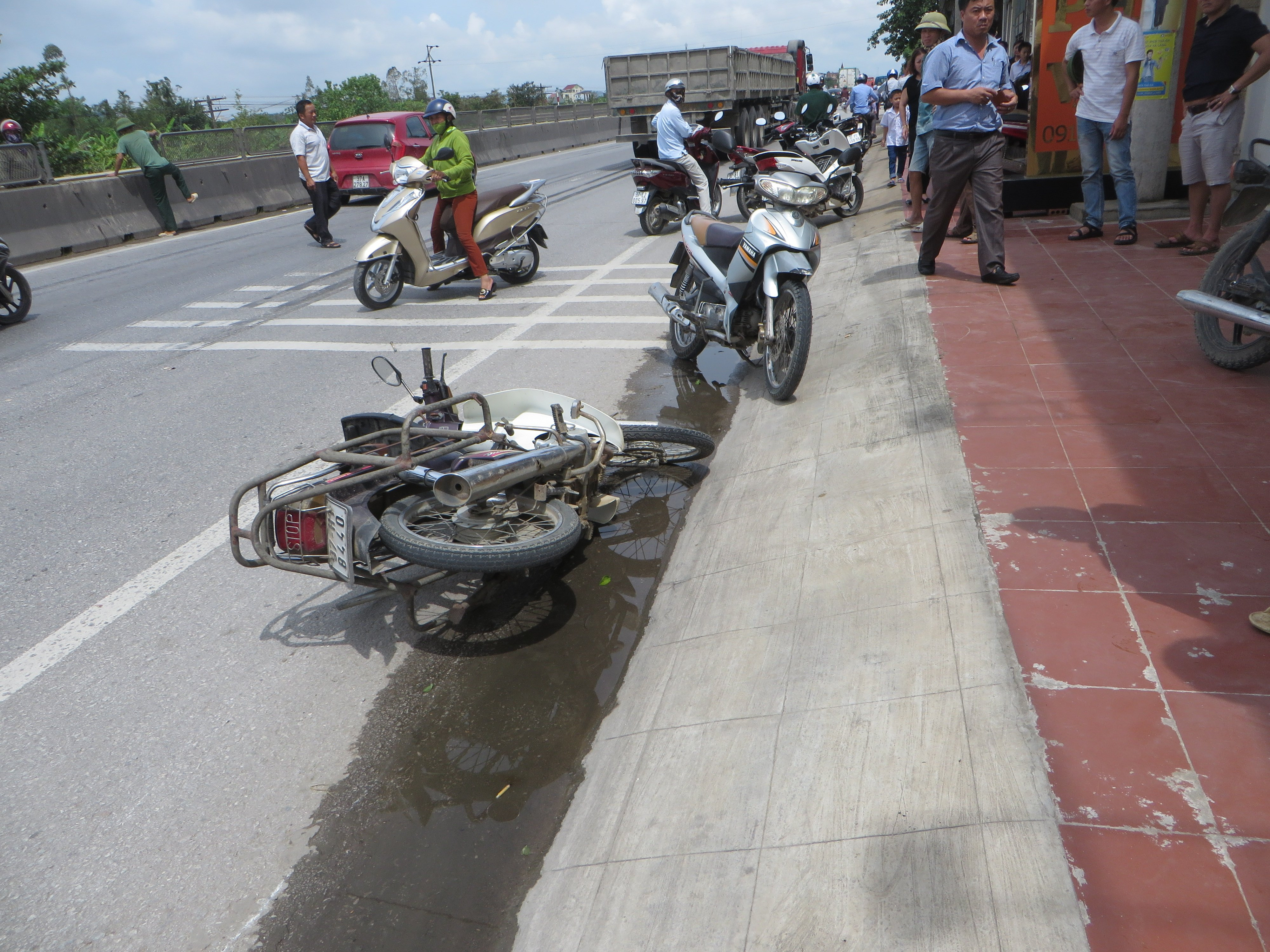 Theo đó, vào thời gian trên, ông Chu Văn Đ. (SN 1966, trú xã Diễn Trường, huyện Diễn Châu, Nghệ An) điều khiển xe máy BKS 37H1-8440 chở thịt gà cho con gái. Khi về đến km 413 +200 (thuộc vị trí nói trên), ông Đ. bị xe container BKS 38C-10260 kéo theo rơ-mooc BKS 38R -00542 đi cùng chiều với tốc độ cao va vào.