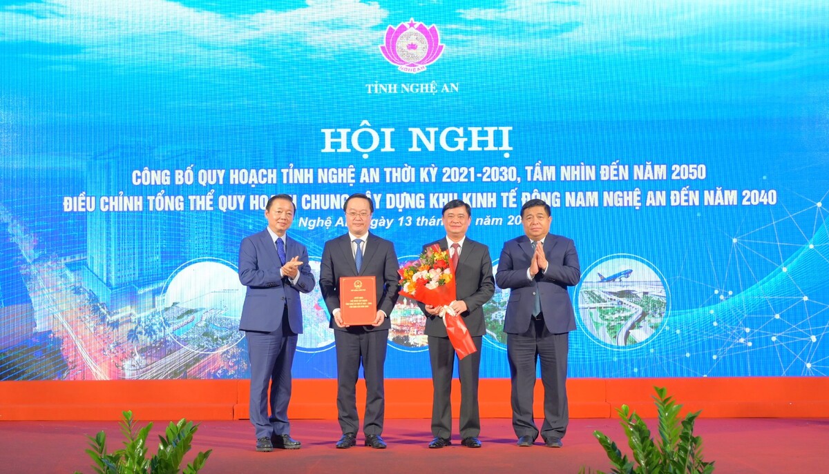 Tại Hội nghị, Phó Thủ tướng Trần Hồng Hà và Bộ trưởng Bộ Kế hoạch và Đầu tư Nguyễn Chí Dũng đã trao quyết định của Thủ tướng về phê duyệt quy hoạch tỉnh Nghệ An thời kỳ 2021 - 2030, tầm nhìn đến năm 2050 cho lãnh đạo tỉnh Nghệ An.