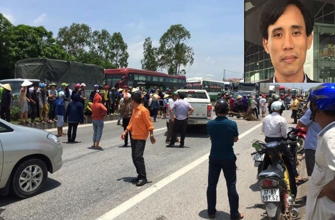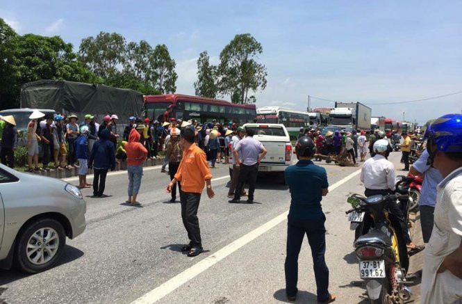 Sau khi bị can Bình bị bắt, một số người bị kích động đứng tràn ra giữa đường quốc lộ dùng cây cối, gạch đá... chặn xe trên quốc lộ 1A đoạn qua Diễn Châu, Nghệ An. (Ảnh: P.T)