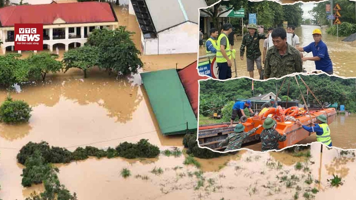Mưa lớn do hoàn lưu bão số 3 khiến nhiều khu vực ở Nghệ An ngập nặng, quốc lộ 7 bị phong tỏa, người dân phải đi lại bằng thuyền.