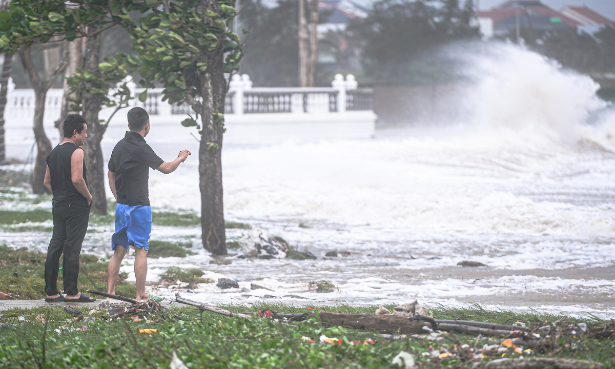 Nhiều nhóm du khách và thanh niên hiếu kỳ tập trung tại khu vực ven biển, bất chấp sóng lớn đang cuộn trào.