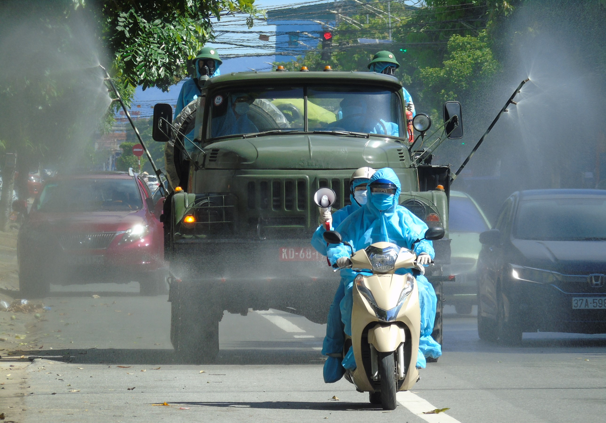 Lực lượng quân đội phun khử trung trên đường Hà Huy Tập, TP Vinh