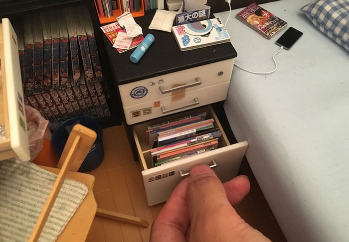 Những đồ vật như sách, máy tính, ghế ngồi đều rất nhỏ và nằm gọn trong lòng bàn tay con người.