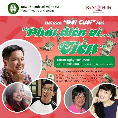 (VTC News) - Ngày 10/10 tới, ngay tại khuôn viên Khu du lịch Bà Nà Hills, khách du lịch sẽ được cười miễn phí với chùm hài kịch đặc biệt “Đời cười mới”- “Phát điên vì tiền” do Đoàn hài kịch Nhà hát Tuổi trẻ (Hà Nội) biểu diễn.