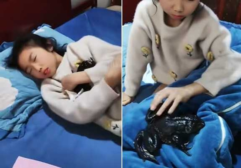 Bé gái ôm ếch trâu đi ngủ, khiến mẹ mình được phen hốt hoảng.